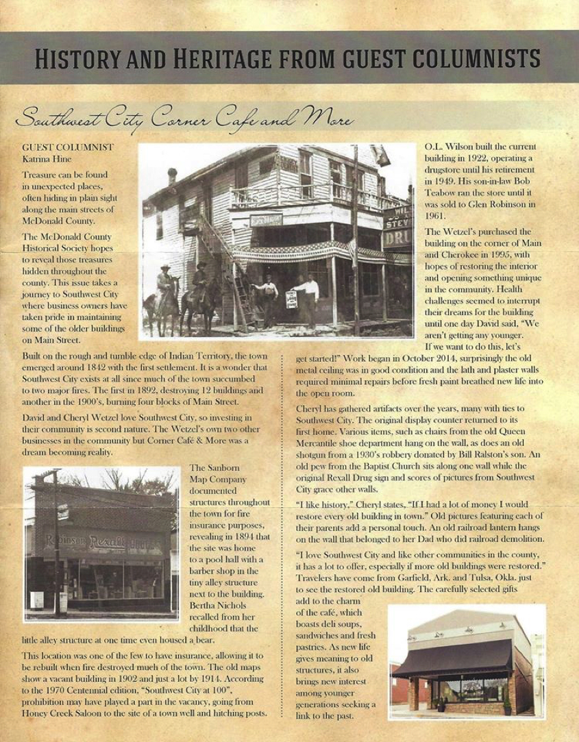 The Corner Cafe and More (featuring Main Sweets Bakery) is located in a 1922 building on the corner of Main St. and Cherokee St., in Southwest City, MO.. The building had long housed the town's "Drug Store" with previous owners of O.L. Wilson, Bob Teabow, Glen Robinson, among others. The Corner Cafe has many restored features and momentos of Southwest City from years past. Two miles south of the Cafe is a historic marker where "Three States Meet" and is a local attraction. The Corner Cafe and More is located just 17 miles from Grand Lake, Grove, OK or 9 miles from Elk River in McDonald County, MO.